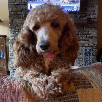 Raleigh is the sweetest Poodle you will ever meet. True to the Poodle breed, Raleigh is loyal and protective of her people. She loves to cuddle and wants nothing more than to spend her days with us and her dog and cat friends. She is a stunning abstract of dark apricot color with white markings. Raleigh has been genetically tested through Embark Vets and Paw Prints. She is OFA CHIC registered with her hips rated GOOD.